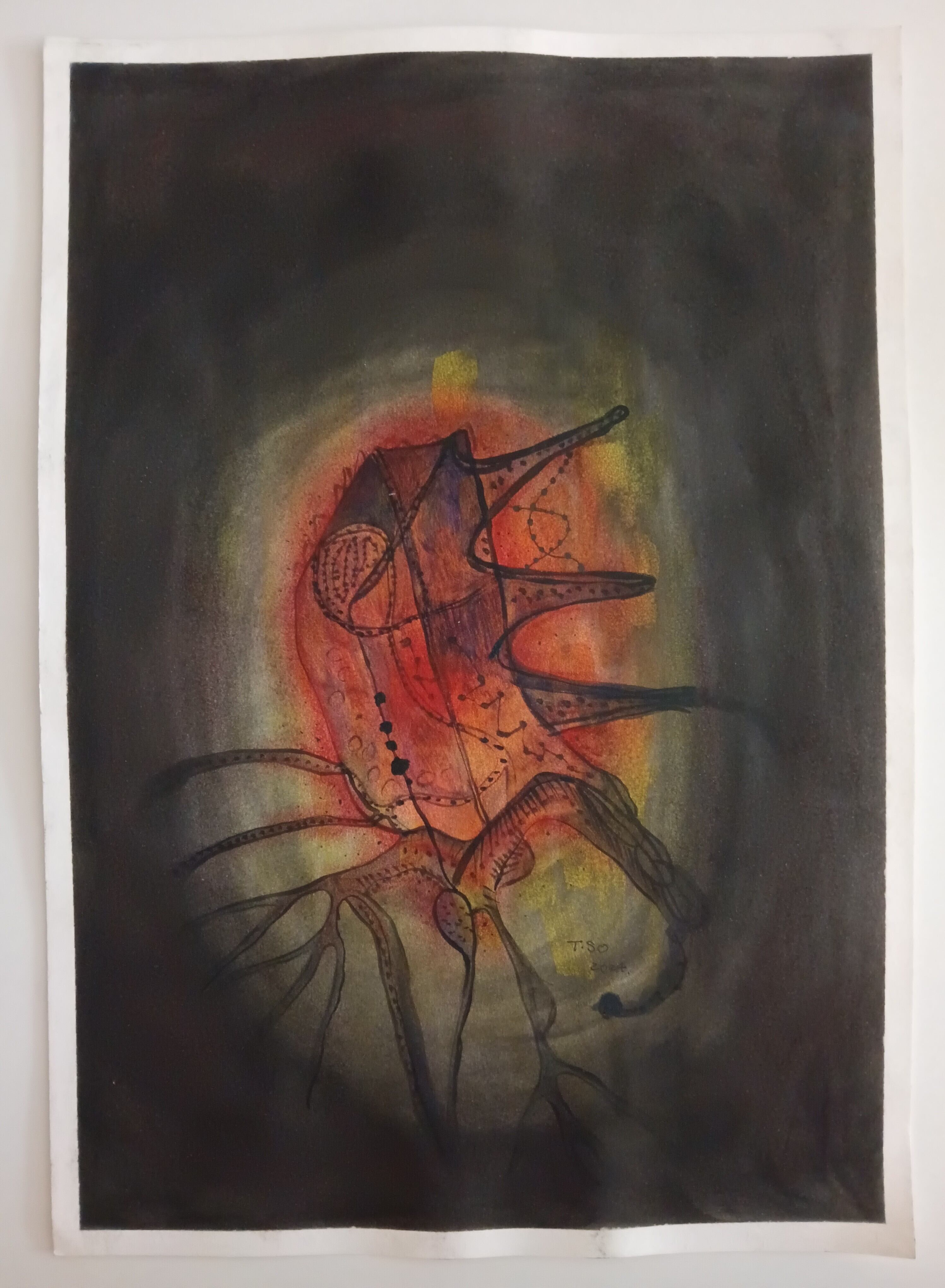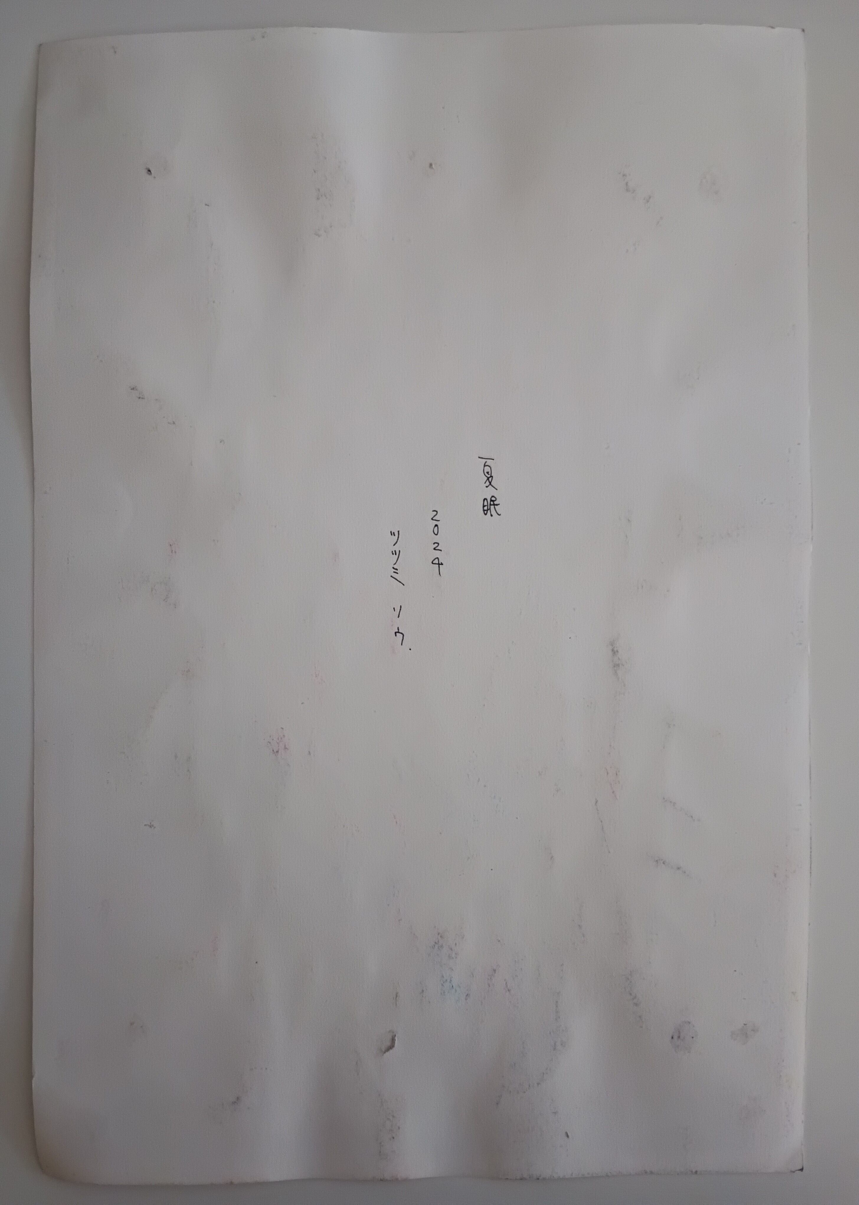 ツツミソウによる絵画作品「夏眠」です。 Medium : 紙に水彩、ガッシュ、インク、パステル Size : 25.7×36.4cm ※額無し。Opp袋にて梱包します。